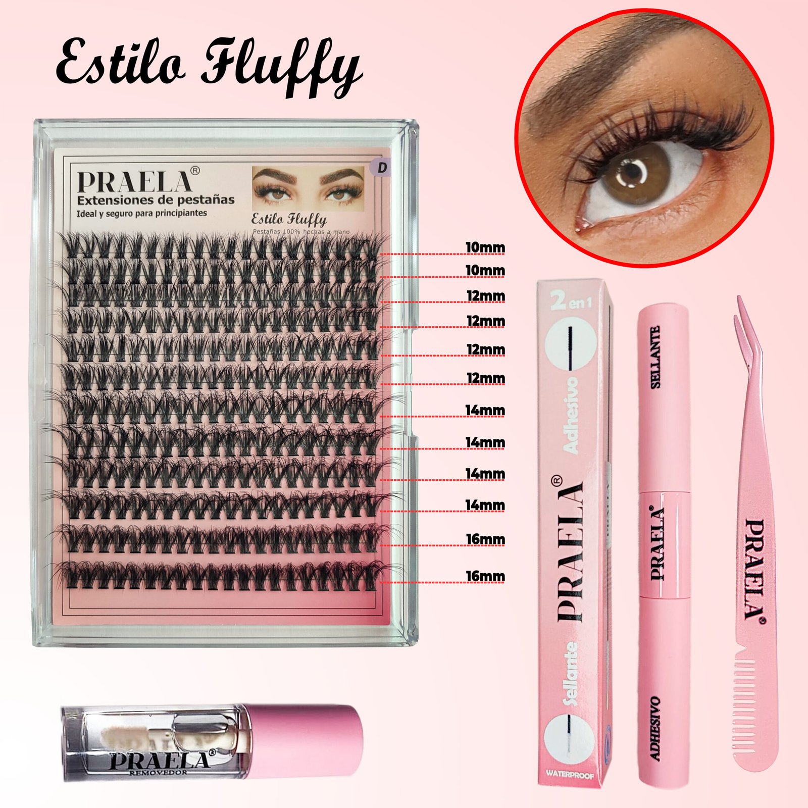 Con el modelo Fluffy lograrás un diseño esponjado y con volumen, aportando a tus ojos un toque natural y desenfadado. Puedes crear distintos mappings, desde un estilo natural con tallas 10 y 12, hasta un foxy eye más llamativo combinando 10, 12 y 14, usando solo 7 a 9 extensiones por ojo. En pocos minutos transformarás tu mirada con resultados de salón, disfrutando de una durabilidad de 7 a 15 días y resistencia al agua para un look impecable por más tiempo.