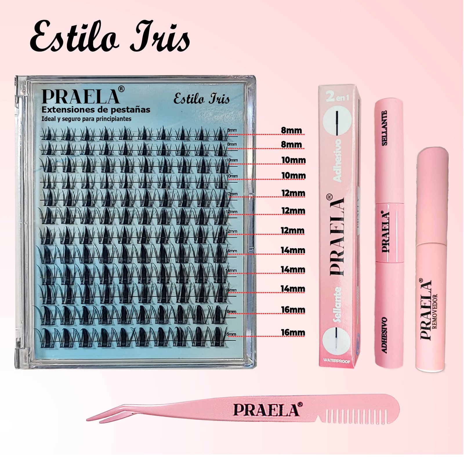 Con el modelo Iris logra unas pestañas con acabado profesional sin salir de casa. Su diseño con efecto anime te permite crear mappings únicos y llamativos que realzan tu mirada con un toque diferente. Gracias a sus medidas que van desde la talla 8 hasta la 16, puedes personalizar estilos espectaculares con solo 5 extensiones por ojo. En pocos minutos transformarás tu mirada con resultados de salón, disfrutando de una durabilidad de 7 a 15 días y resistencia al agua, para lucir un look impecable por más tiempo.